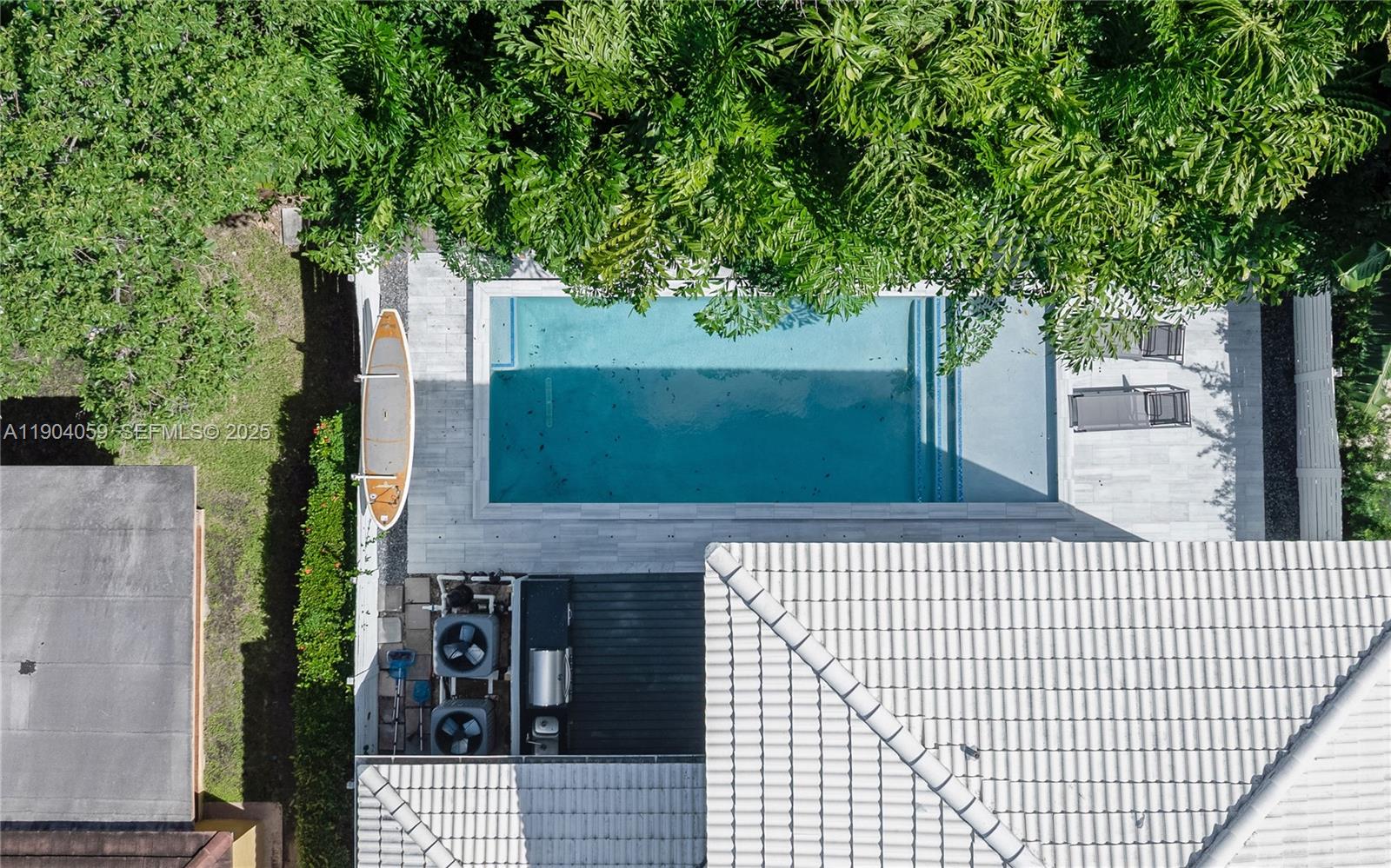 Relax in the expansive private yard featuring a below-ground pool, perfect for entertaining w/ a built-in barbecue, outdoor kitchen & gas grill. The hurricane impact windows & smart thermostat enhance your comfort.